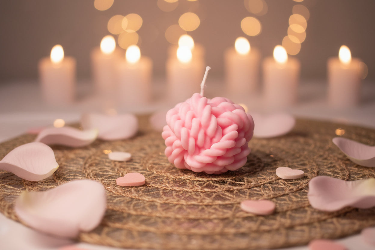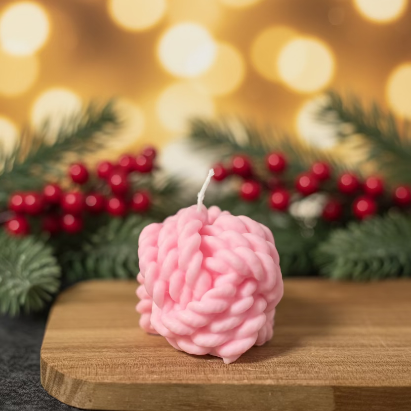 Dekorativt ljus med vacker stickad struktur som påminner om en mjuk, stickad tröja. Den rosa färgen ger ett varmt och ombonat intryck, perfekt för att skapa en mysig och hemtrevlig känsla i rummet.